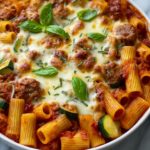 This Baked Rigatoni Fra Diavolo with Sausage and Zucchini is a spicy, comforting Italian-American casserole featuring tender rigatoni pasta baked with a flavorful spicy tomato sauce, sautéed Italian sausage, golden zucchini rounds, fresh herbs, and a luscious blend of mozzarella and Parmesan cheese. Perfect for a family dinner, this dish balances heat with fresh basil and mint, creating a rich, hearty meal bursting with Mediterranean flavors.