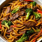 Finish your Beef Lo Mein Recipe by sprinkling sliced green onions on top for a fresh, bright bite. Serve it piping hot and get ready to enjoy the comforting and vibrant flavors you’ve whipped up from scratch.