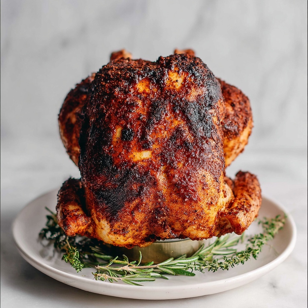 This Beer Can Chicken recipe features a whole chicken seasoned with a flavorful blend of smoked paprika, garlic, onion powder, fresh herbs, and olive oil, cooked upright on a beer can over indirect heat on the grill. The beer steams the interior while the grill crisps the skin, resulting in juicy, tender, and aromatic chicken perfect for outdoor gatherings.