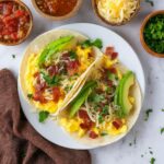 Now it’s the most rewarding part — layering your breakfast tacos. Add scrambled eggs, bacon, and chorizo to each tortilla, then top generously with shredded cheddar cheese. Add jalapeno slices for heat, a spoonful of sharp salsa for tang, and finish with fresh cilantro for an herbal burst. Each bite is a delicious mix of textures and flavors that you’ll love sharing or savoring solo.
