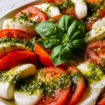 A fresh and vibrant Caprese Salad featuring ripe tomatoes, creamy fresh mozzarella, and aromatic basil, complemented by a homemade pesto dressing. This simple Italian classic is perfect as a light appetizer or side dish, combining bright flavors and creamy textures in just 20 minutes.
