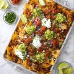 - Add Toppings and Serve: Remove the sheet pan from the oven and immediately top the nachos with dollops of sour cream, guacamole, salsa, sliced red onion, and chopped cilantro according to your preference. Serve right away while warm and cheesy.