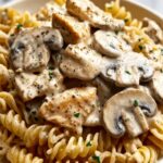 Add the cooked pasta and reserved chicken back into the skillet with the creamy mushroom sauce. Toss gently to coat everything evenly. If the sauce feels too thick, loosen it with a splash of the reserved pasta water—it helps the sauce adhere better. Taste and adjust seasoning with salt and pepper as needed, ensuring every bite bursts with balanced flavor.