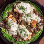 - Combine and Broil: Return chicken to the pan, turning to coat with sauce. Arrange mushrooms and asparagus on top. Sprinkle 1 cup shredded mozzarella evenly over the dish. Place pan under broiler for 3-4 minutes until cheese melts and bubbles. Remove and garnish with fresh parsley before serving.