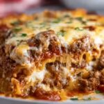Preheat your oven to 375°F (190°C). Spread a thin layer of the meat sauce on the bottom of a 9×13-inch baking dish—this prevents sticking and adds flavor right from the base up. Layer half of your cooked pasta on top, then spread the ricotta cheese mixture evenly over it. Add half of the remaining meat sauce, followed by the rest of the pasta and the remaining sauce on top.