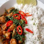 - Serve: Serve the coconut chicken and rice warm with lime wedges on the side to add a bright, citrusy note to the dish.