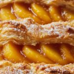 On a lightly floured surface, roll out the dough into a 1/4 inch thick rectangle. This thickness is perfect for wrapping around those sweet peaches without being too doughy or too thin to hold its shape.