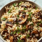 A savory Mushroom Rice recipe featuring caramelized cremini mushrooms sautéed with garlic and onions, simmered with long-grain rice in low-sodium broth and fresh thyme. This comforting, flavorful dish is perfect as a hearty side or a light main course.