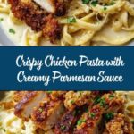 This Crispy Chicken with Creamy Pasta recipe features golden, parmesan-crusted chicken breasts served atop tender fettuccine or penne pasta coated in a rich and velvety garlic cream sauce. Perfectly balanced with garlic, Parmesan, and subtle spices, this Italian-American dish is both comforting and elegant for a satisfying weeknight dinner or special occasion.