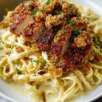 This Crispy Chicken with Creamy Pasta recipe features golden, parmesan-crusted chicken breasts served atop tender fettuccine or penne pasta coated in a rich and velvety garlic cream sauce. Perfectly balanced with garlic, Parmesan, and subtle spices, this Italian-American dish is both comforting and elegant for a satisfying weeknight dinner or special occasion.