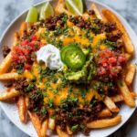 These Crispy Spicy Loaded Nacho Fries are a deliciously bold twist on classic fries, featuring perfectly double-fried russet potatoes coated in a smoky, spicy seasoning blend, then topped with cheddar cheese, sour cream, jalapeños, guacamole, salsa, and fresh cilantro. Ideal for sharing as a flavorful appetizer or indulgent snack.