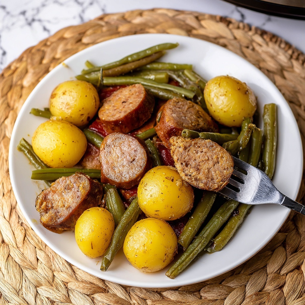 A hearty and flavorful Crockpot Sausage and Potatoes dish featuring smoked sausage, baby potatoes, fresh green beans, and a blend of savory seasonings, all slow-cooked to tender perfection. This easy one-pot meal is perfect for busy days and serves a comforting family-sized portion.