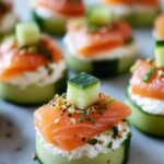 - Add smoked salmon: Gently fold or roll small pieces of smoked salmon and place one on top of each cream cheese dollop on the cucumber slices.
