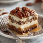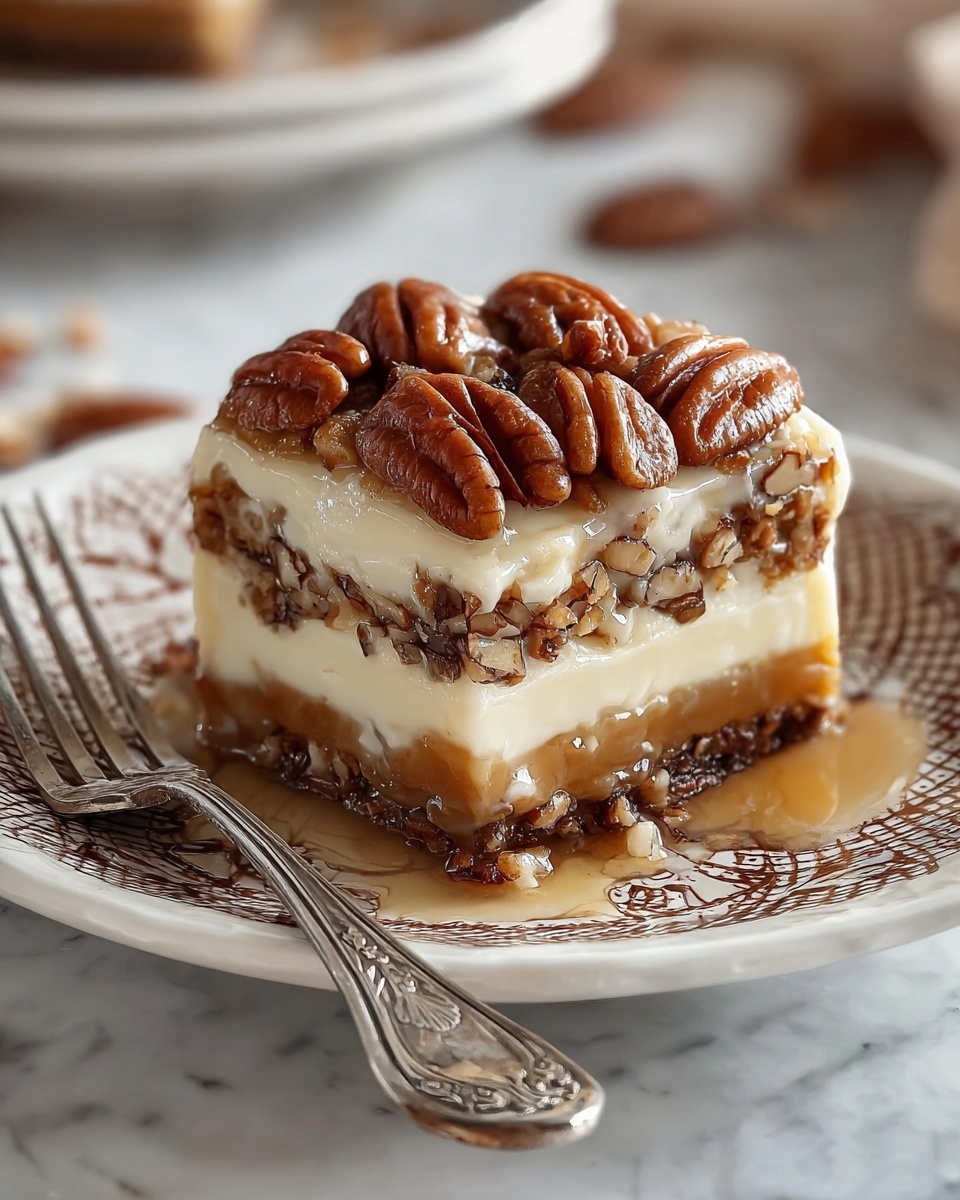 Decadent Pecan Pie Lasagna combines the rich flavors of pecan pie with the creamy texture of a layered dessert. This no-bake lasagna features a graham cracker crust, a smooth cream cheese layer, a luscious pecan pie filling, and a topping of whipped cream and caramel, making it an indulgent treat perfect for gatherings and special occasions.