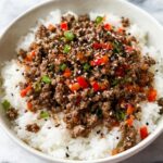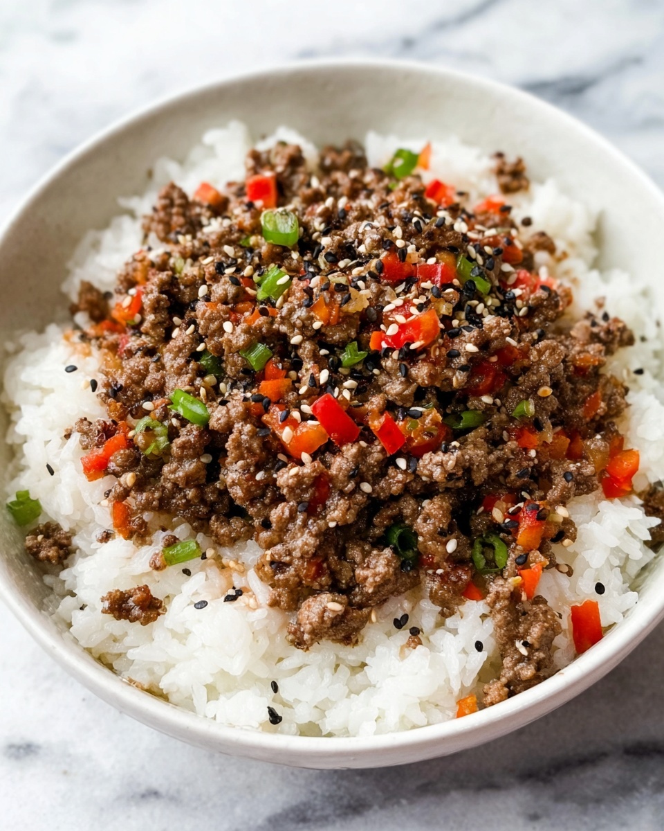 - Assemble and serve: Spoon the beef mixture over the cooked rice. Garnish with scallions and sesame seeds as desired for extra flavor and crunch.