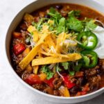 - Season and serve: Taste the chili and season with salt and pepper as needed. Serve hot in bowls with optional toppings such as sour cream, avocado slices, tortilla strips, scallions, and cheese as desired.