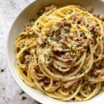 Once the pasta is ready, reserve a couple of tablespoons of the starchy pasta water and add it to the tuna sauce – this helps the sauce cling to the noodles. Drain the pasta and toss it thoroughly with the sauce. Season well with salt and pepper to taste. For an extra special touch, you can sprinkle freshly grated parmesan cheese and lemon zest on top to elevate the flavors even more.