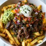 These Easy Carne Asada Loaded Fries combine crispy oven-baked russet potatoes with flavorful grilled carne asada, melted cheese, and fresh toppings like guacamole, sour cream, jalapeños, and cilantro. Perfect as a hearty appetizer or main dish, this recipe brings together Tex-Mex flair with simple preparation for a delicious and satisfying meal.