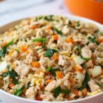 In a large bowl, mix together the shredded chicken, cooked rice, and softened vegetables. Drizzle with olive oil to add essential fats, and if you’re feeling adventurous, sprinkle a small amount of ground turmeric for a touch of flavor and health benefits. Stir everything thoroughly until well combined.
