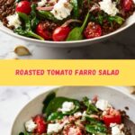 - Roast Tomatoes and Toast Farro: Toss the grape tomatoes with 1 tablespoon of olive oil, 1/4 teaspoon salt, and 1/4 teaspoon black pepper on a baking tray. Spread the dry farro on a separate baking tray. Place the farro tray on the top oven shelf and the tomatoes underneath. Bake for 8 minutes, shaking the trays halfway through. The farro should become browned with a nutty aroma, and the tomatoes should look slightly wrinkled but remain intact.