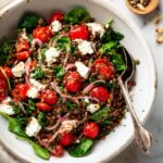 A vibrant and hearty Farro Salad enhanced with the tangy notes of apple cider vinegar and roasted grape tomatoes, complemented by a sizzling garlic, coriander, and cumin dressing. This nutritious salad balances the nutty texture of toasted farro with fresh baby spinach and creamy goat cheese, making it a perfect, flavorful dish for any season.
