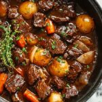 French Beef Bourguignon is a classic French stew featuring tender beef cubes slowly simmered in rich red wine and beef broth with bacon, mushrooms, carrots, and aromatics. This hearty, flavorful dish is perfect for impressing guests or enjoying a comforting meal at home.
