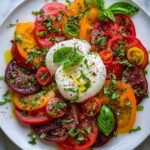 A refreshing and elegant Fresh Tomato Burrata Salad featuring ripe heirloom and cherry tomatoes, creamy burrata cheese, fresh basil, and a drizzle of high-quality extra virgin olive oil. This no-cook salad highlights simple, fresh ingredients perfect for a light appetizer or side dish.