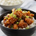 This recipe for General Tso’s Chicken features crispy battered chicken pieces coated in a flavorful, tangy, and slightly sweet sauce made with soy sauce, rice vinegar, and hoisin. Perfect for a homemade takeout-style meal, it’s garnished with green onions and sesame seeds, offering a delightful balance of savory, sweet, and tangy flavors with a satisfying crispy texture.