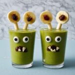 Skewer the banana slices onto the lollipop sticks. Cut the raisins in half and press them onto the bananas to form pupils and the nose, giving your monster expressive, playful features. Place the sticks into the smoothie, and your Green Smoothie Monster Recipe is ready to impress!