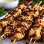 These grilled chicken skewers feature tender, juicy chicken thighs marinated in a flavorful blend of olive oil, soy sauce, lime juice, and aromatic spices. Perfectly grilled to achieve a smoky char and basted for extra zest, this recipe is a quick and delicious way to enjoy a classic BBQ favorite.