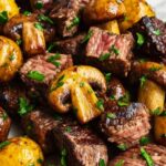 Toss your steak cubes, parboiled potatoes, and halved mushrooms in the marinade using a large resealable plastic bag or a shallow dish. Make sure everything is well coated. Let it rest for at least 30 minutes; longer if time allows, up to 2 hours, for the most flavorful results.