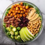 5. Assemble the bowl: Begin by placing a layer of cooked quinoa in your serving bowls. Arrange the roasted vegetables on top, add the chickpeas and roughly chopped kale or spinach, then layer with sliced apples or pears and sprinkle dried cranberries or pomegranate seeds if using. Drizzle the creamy tahini dressing liberally over the bowl and finish with toasted nuts on top for crunch.