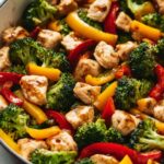 - Add vegetables and garlic: Incorporate the minced garlic, broccoli florets, bell peppers, and zucchini slices into the skillet with the chicken.