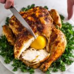 Generously rub the spice mixture all over your whole chicken, making sure to get some of it inside the cavity as well. Then, place the pricked lemon right inside the chicken’s cavity. This technique allows the lemon’s bright acidity to gently infuse the meat as it cooks, giving you that signature tangy punch.