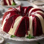 Serve this layered red velvet cheesecake bundt cake recipe on a beautiful cake stand surrounded by rose petals or seasonal greenery for a festive feel. For parties, slice individual pieces and serve them on delicate plates with a small fork and a garnish of mint leaves for a classy presentation.