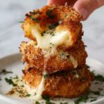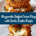 Mozzarella Stuffed Onion Rings with Garlic Butter are a crispy and cheesy appetizer or snack featuring sweet onion rings filled with melted mozzarella, breaded and baked to golden perfection, then drizzled with flavorful garlic butter for an irresistible bite.