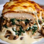 This Mushroom Stuffed Chicken Breast recipe features tender chicken breasts filled with a savory mixture of sautéed mushrooms, garlic, thyme, spinach, and melted mozzarella cheese. The chicken is first seared to a golden brown before being baked to juicy perfection, making a delicious and elegant main dish perfect for a cozy dinner.