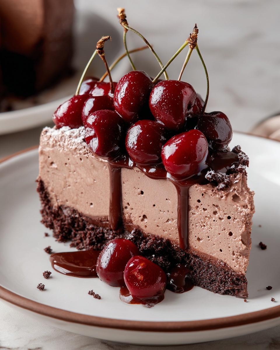 Pair this cheesecake with a cup of freshly brewed coffee or a glass of dessert wine like a late harvest Riesling. Light fruit salads or sorbets also complement the rich chocolate and cherry flavors without overpowering the palate.