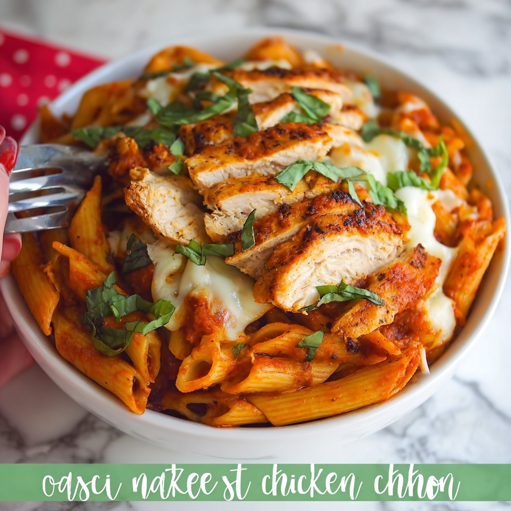 - Serve and garnish: Plate the pasta bake by spooning portions onto four plates, each topped with a chicken breast and vegetables from the dish. Garnish with fresh basil leaves if desired, and serve immediately for best flavor and warmth.