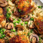 This One Pan Chicken & Rice Casserole is a comforting, easy-to-make dish featuring tender bone-in chicken thighs seared to golden perfection and baked with a flavorful mixture of rice, mushrooms, onions, garlic, and peas. All cooked together in an oven-safe skillet, this hearty meal delivers delicious, home-cooked goodness with minimal cleanup.