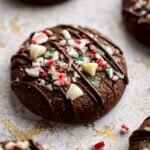Once baked, let the cookies cool on the baking sheet for a few minutes so they firm up slightly, then transfer them to a wire rack. If you’d like, melt some extra chocolate chips in short bursts in the microwave and drizzle over the cookies using a fork. While the chocolate drizzle is still warm, sprinkle on the crushed candy canes to create a beautiful, festive finish.