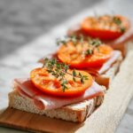 Next, gently lay one slice of prosciutto atop the ricotta. Follow this with two thin slices of ripe persimmon. The combination of silky meat and fruity sweetness is what makes this Persimmon Prosciutto Crostini Recipe uniquely irresistible.