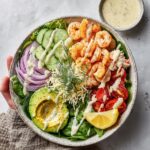 First, gather your salad greens, cherry tomatoes, red onion, and diced avocado in a large mixing bowl. These ingredients create the perfect fresh and crunchy foundation for your salad, making every bite refreshing and full of garden-fresh flavor. Add in the cooked prawns to gently fold in the protein without mashing the delicate avocado.