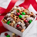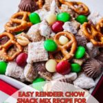 This festive Reindeer Chow recipe is a delightful holiday snack mix combining chocolate, peanut butter, caramel, and a variety of crunchy and sweet mix-ins like pretzels, mini peanut butter cups, M&M’s, and white chocolate chips. It’s sweet, salty, and perfect for sharing during the holiday season.