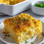 Let the casserole rest for 5 to 10 minutes before serving. This brief pause helps it set slightly for easier serving, while the optional sprinkling of chopped chives or green onions adds a fresh pop of color and mild bite that balances the richness.