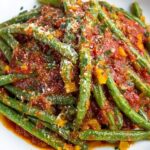 This Savory Green Beans with Fresh Tomato Sauce recipe features tender green beans cooked to a perfect crisp-tender texture and simmered in a vibrant, homemade fresh tomato sauce. Enhanced with garlic, onion, basil, and a touch of red pepper flakes, this dish serves as a flavorful and healthy side that’s easy to prepare and packed with fresh, garden-inspired ingredients.