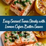 This easy and elegant recipe for Seared Tuna Steaks with Lemon, Caper & Parsley Butter features fresh tuna steaks quickly seared to perfection and topped with a vibrant, tangy butter sauce made with capers, fresh parsley, and lemon juice. It’s a light, flavorful dish perfect for a healthy dinner or special occasion.