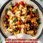 This Southwest Chicken Wrap recipe features tender, spiced chicken breasts cooked on the stovetop and combined with a creamy, tangy lime sauce, shredded cheddar cheese, black beans, corn, tomatoes, onions, and cilantro, all wrapped in a warm flour tortilla. It’s a flavorful, satisfying meal perfect for lunch or dinner with a bold southwest flair.