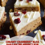 Spread the frosting evenly over the cooled bars. Sprinkle the chopped dried cranberries on top, then drizzle with melted white chocolate for that iconic Cranberry Bliss look and extra indulgence.