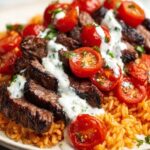 This hearty Steak & Queso Rice recipe combines perfectly cooked basmati rice infused with rich spices and crushed tomatoes, topped with tender, seared sirloin steak and creamy white queso. It’s a flavorful one-pan meal ideal for a satisfying dinner, garnished with fresh cilantro and optionally served with warm flour tortillas.